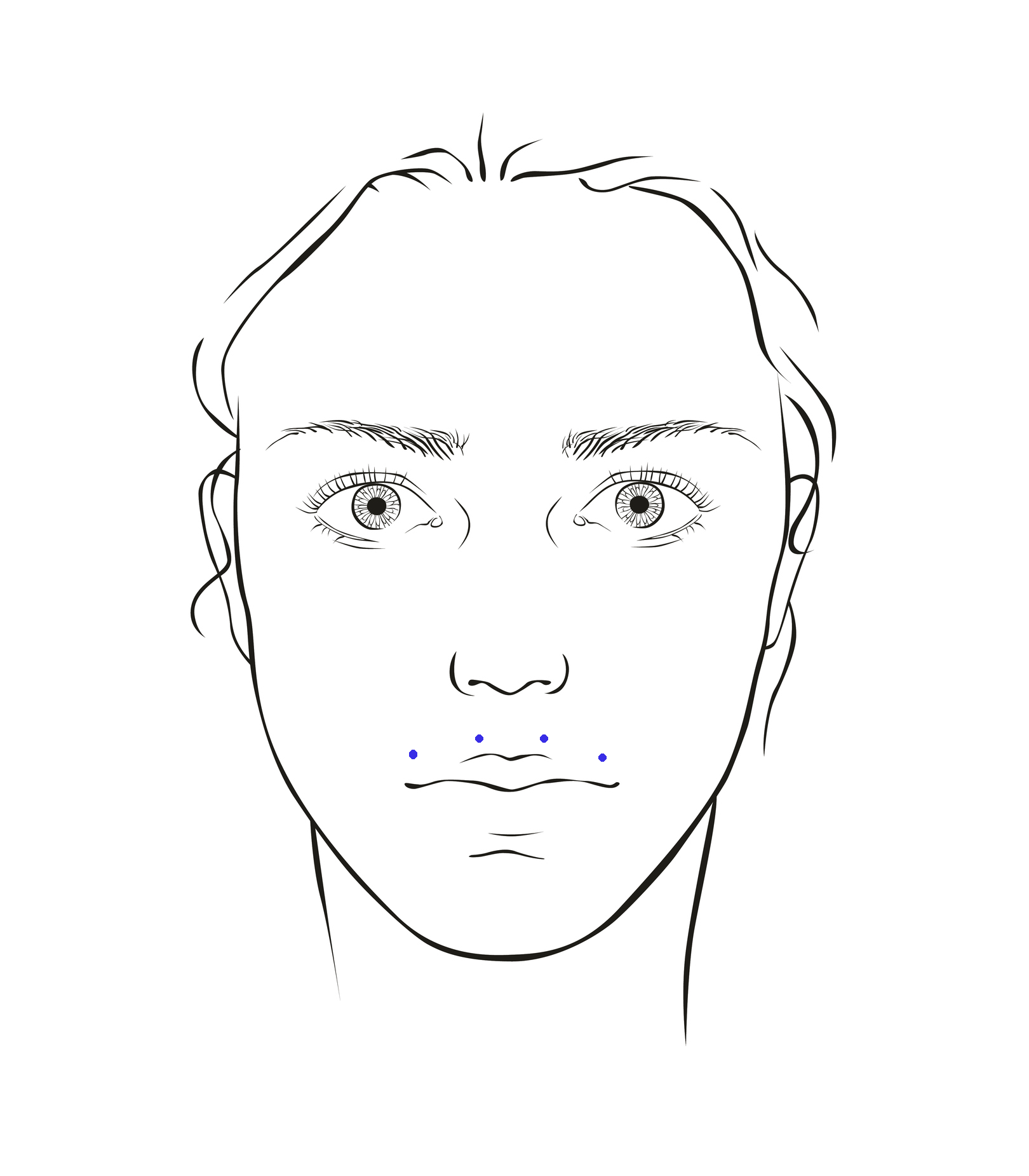 Durch oberflächliche Injektionen direkt oberhalb der Oberlippe (siehe rechts) können die Fasern des runden Mundmuskels gehemmt werden und so das „Einklappen“ der Lippe minimiert werden.